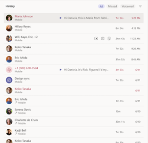 Your call history moves to the centre of the calls experience and shows a list of past calls (including missed calls). To return a missed call, hover over a contact from your call history list and select More actions > Call back