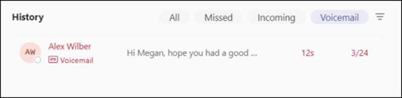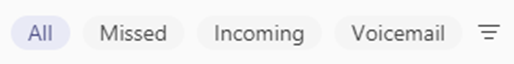 To review a list of calls you have missed, lists of calls that came in, and your voicemail, select between the available filters at the top of the call history list.