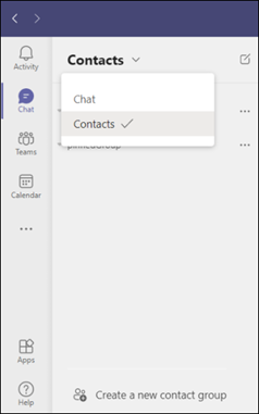 on the left side of Teams. Then select the Chat dropdown at the top and select Contacts.