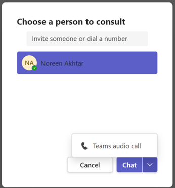 Under Choose a person to consult, start typing the name of the person you want to reach or type in the number you want to call, and select them when they appear.