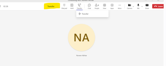Please note: the Transfer button with the telephone icon will not transfer the customer to the relevant person. This feature allows you to make a new transfer. E.g. this will transfer the colleague (not the caller) to another member of staff.