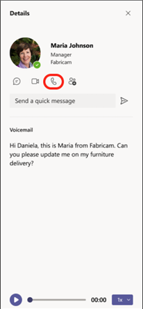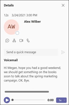 When you select a voicemail, you can review and access details and other information—all on the right side of Teams.