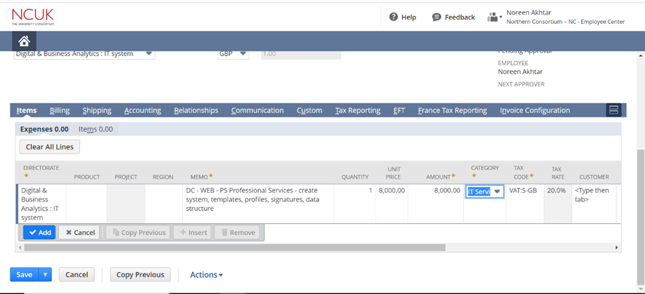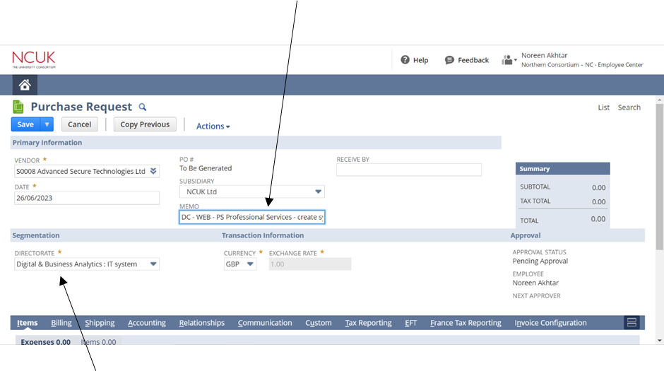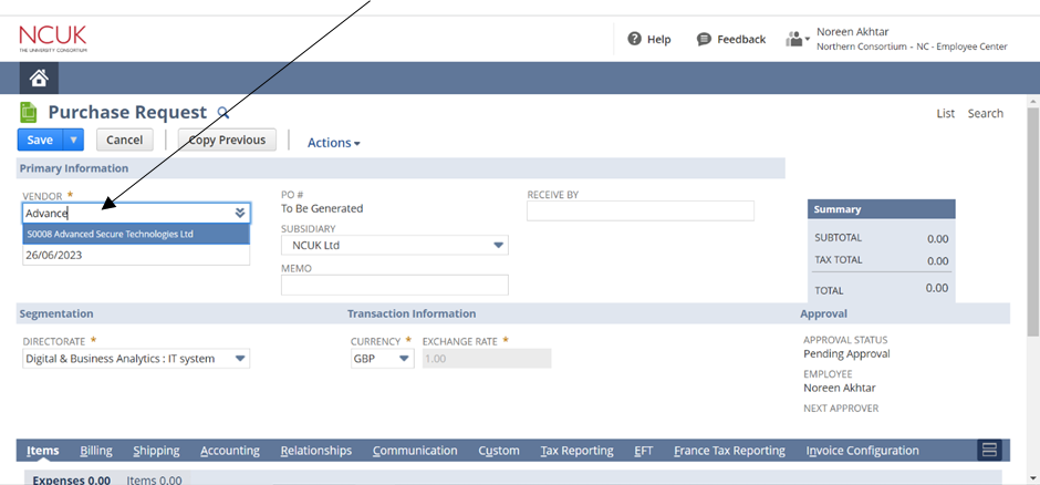 - Select the relevant Directorate – this should automatically be selected based on the Vendor you selected.