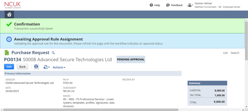 - Click on the PO date to open. There will be a button near ‘Actions’ labelled ‘Accept’. Click on this button to complete the approval process.