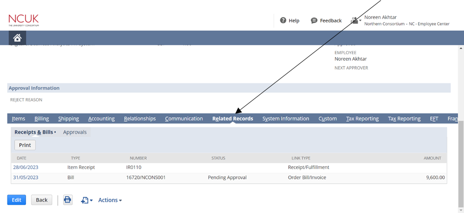 - Once the Purchase Order has been approved, you need to approve the invoice. To do so, go to the main dashboard, and select the approved Purchase Order Request, and click on ‘Related Records’.