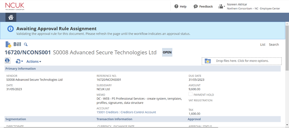 - In the ‘Vendor’ box, start typing the name of the company who sent the invoice. A suggestion will appear, and you can select the relevant company name.