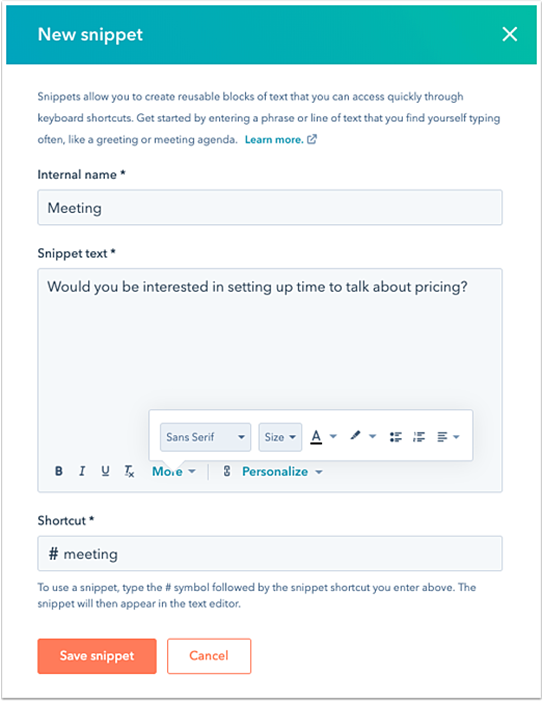 Snippets are short, reusable text blocks that can be used on contact, company, deal and ticket records; in email templates; in chat conversations; and when logging an activity or note.